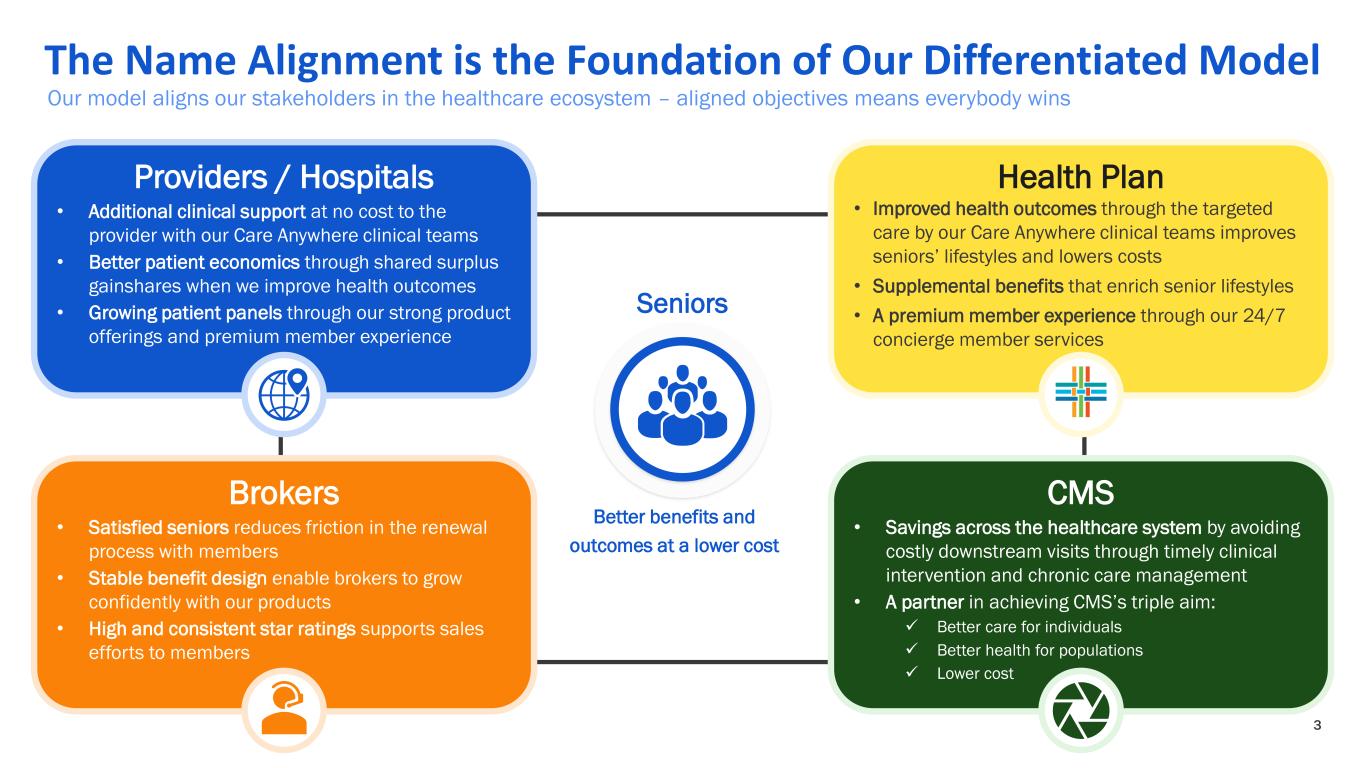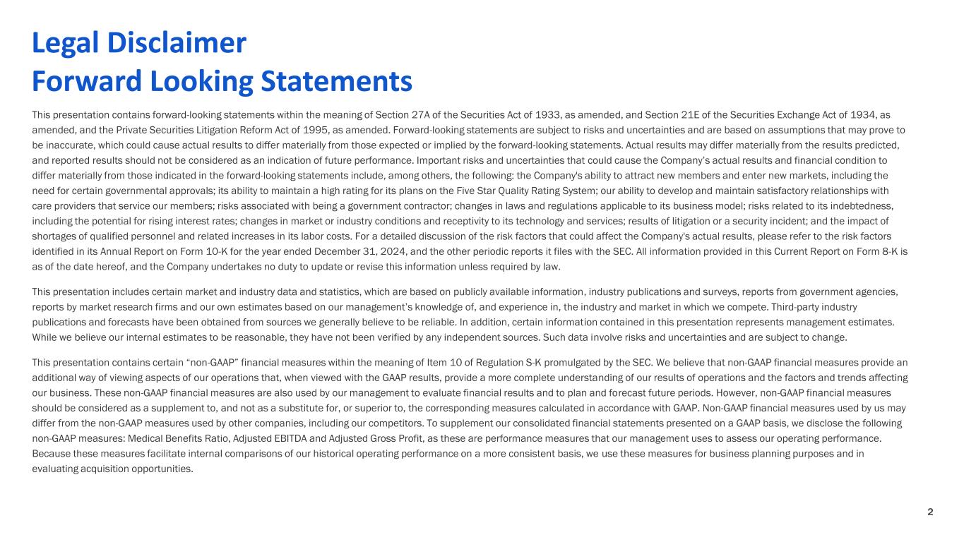 2 Legal Disclaimer Forward Looking Statements This presentation contains forward-looking statements within the meaning of Section 27A of the Securities Act of 1933, as amended, and Section 21E of the Securities Exchange Act of 1934, as amended, and the Private Securities Litigation Reform Act of 1995, as amended. Forward-looking statements are subject to risks and uncertainties and are based on assumptions that may prove to be inaccurate, which could cause actual results to differ materially from those expected or implied by the forward-looking statements. Actual results may differ materially from the results predicted, and reported results should not be considered as an indication of future performance. Important risks and uncertainties that could cause the Company’s actual results and financial condition to differ materially from those indicated in the forward-looking statements include, among others, the following: the Company's ability to attract new members and enter new markets, including the need for certain governmental approvals; its ability to maintain a high rating for its plans on the Five Star Quality Rating System; our ability to develop and maintain satisfactory relationships with care providers that service our members; risks associated with being a government contractor; changes in laws and regulations applicable to its business model; risks related to its indebtedness, including the potential for rising interest rates; changes in market or industry conditions and receptivity to its technology and services; results of litigation or a security incident; and the impact of shortages of qualified personnel and related increases in its labor costs. For a detailed discussion of the risk factors that could affect the Company's actual results, please refer to the risk factors identified in its Annual Report on Form 10-K for the year ended December 31, 2024, and the other periodic reports it files with the SEC. All information provided in this Current Report on Form 8-K is as of the date hereof, and the Company undertakes no duty to update or revise this information unless required by law. This presentation includes certain market and industry data and statistics, which are based on publicly available information, industry publications and surveys, reports from government agencies, reports by market research firms and our own estimates based on our management’s knowledge of, and experience in, the industry and market in which we compete. Third-party industry publications and forecasts have been obtained from sources we generally believe to be reliable. In addition, certain information contained in this presentation represents management estimates. While we believe our internal estimates to be reasonable, they have not been verified by any independent sources. Such data involve risks and uncertainties and are subject to change. This presentation contains certain “non-GAAP” financial measures within the meaning of Item 10 of Regulation S-K promulgated by the SEC. We believe that non-GAAP financial measures provide an additional way of viewing aspects of our operations that, when viewed with the GAAP results, provide a more complete understanding of our results of operations and the factors and trends affecting our business. These non-GAAP financial measures are also used by our management to evaluate financial results and to plan and forecast future periods. However, non-GAAP financial measures should be considered as a supplement to, and not as a substitute for, or superior to, the corresponding measures calculated in accordance with GAAP. Non-GAAP financial measures used by us may differ from the non-GAAP measures used by other companies, including our competitors. To supplement our consolidated financial statements presented on a GAAP basis, we disclose the following non-GAAP measures: Medical Benefits Ratio, Adjusted EBITDA and Adjusted Gross Profit, as these are performance measures that our management uses to assess our operating performance. Because these measures facilitate internal comparisons of our historical operating performance on a more consistent basis, we use these measures for business planning purposes and in evaluating acquisition opportunities.
