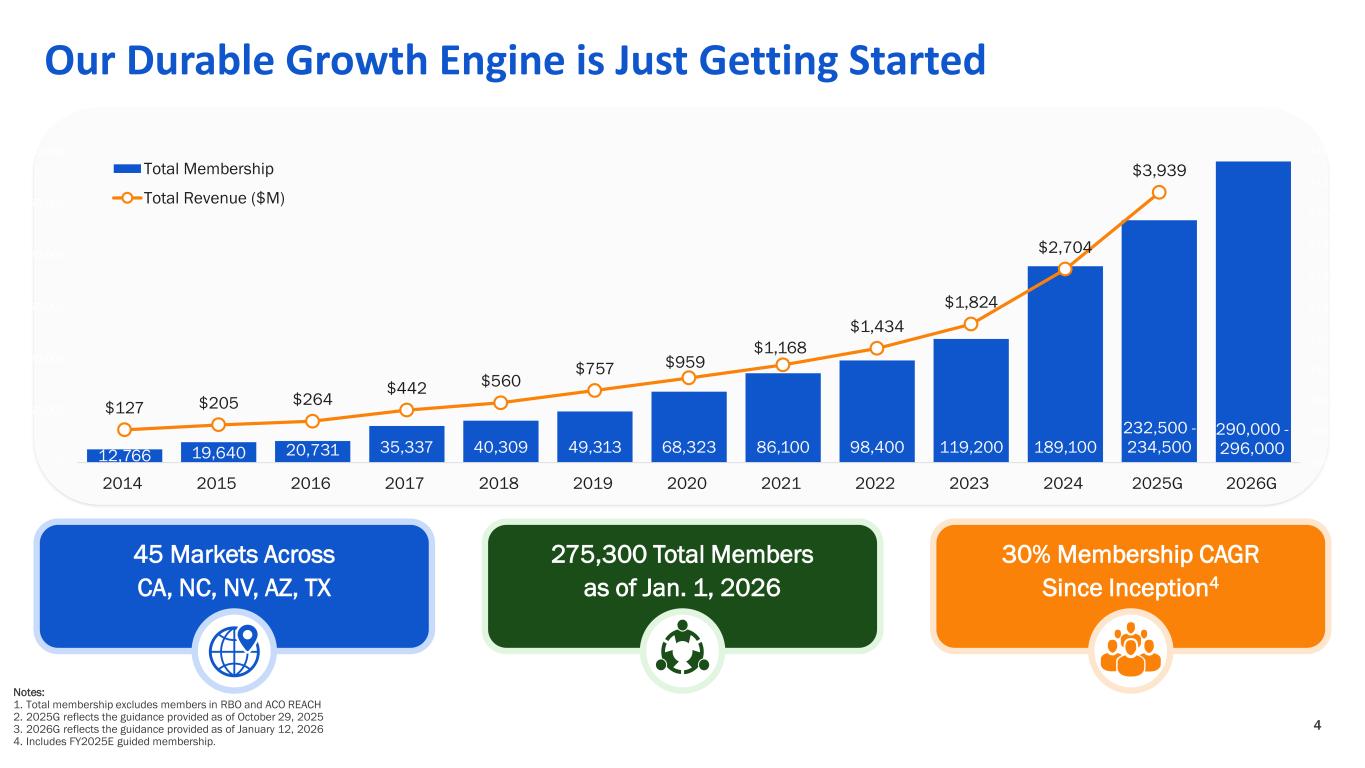 4 Our Durable Growth Engine is Just Getting Started Notes: 1. Total membership excludes members in RBO and ACO REACH 2. 2025G reflects the guidance provided as of October 29, 2025 3. 2026G reflects the guidance provided as of January 12, 2026 4. Includes FY2025E guided membership. 45 Markets Across CA, NC, NV, AZ, TX 275,300 Total Members as of Jan. 1, 2026 30% Membership CAGR Since Inception4 12,766 19,640 20,731 35,337 40,309 49,313 68,323 86,100 98,400 119,200 189,100 232,500 - 234,500 290,000 - 296,000 $127 $205 $264 $442 $560 $757 $959 $1,168 $1,434 $1,824 $2,704 $3,939 ($400) $100 $600 $1,100 $1,600 $2,100 $2,600 $3,100 $3,600 $4,100 $4,600 0 50,000 100,000 150,000 200,000 250,000 300,000 2014 2015 2016 2017 2018 2019 2020 2021 2022 2023 2024 2025G 2026G Total Membership Total Revenue ($M)