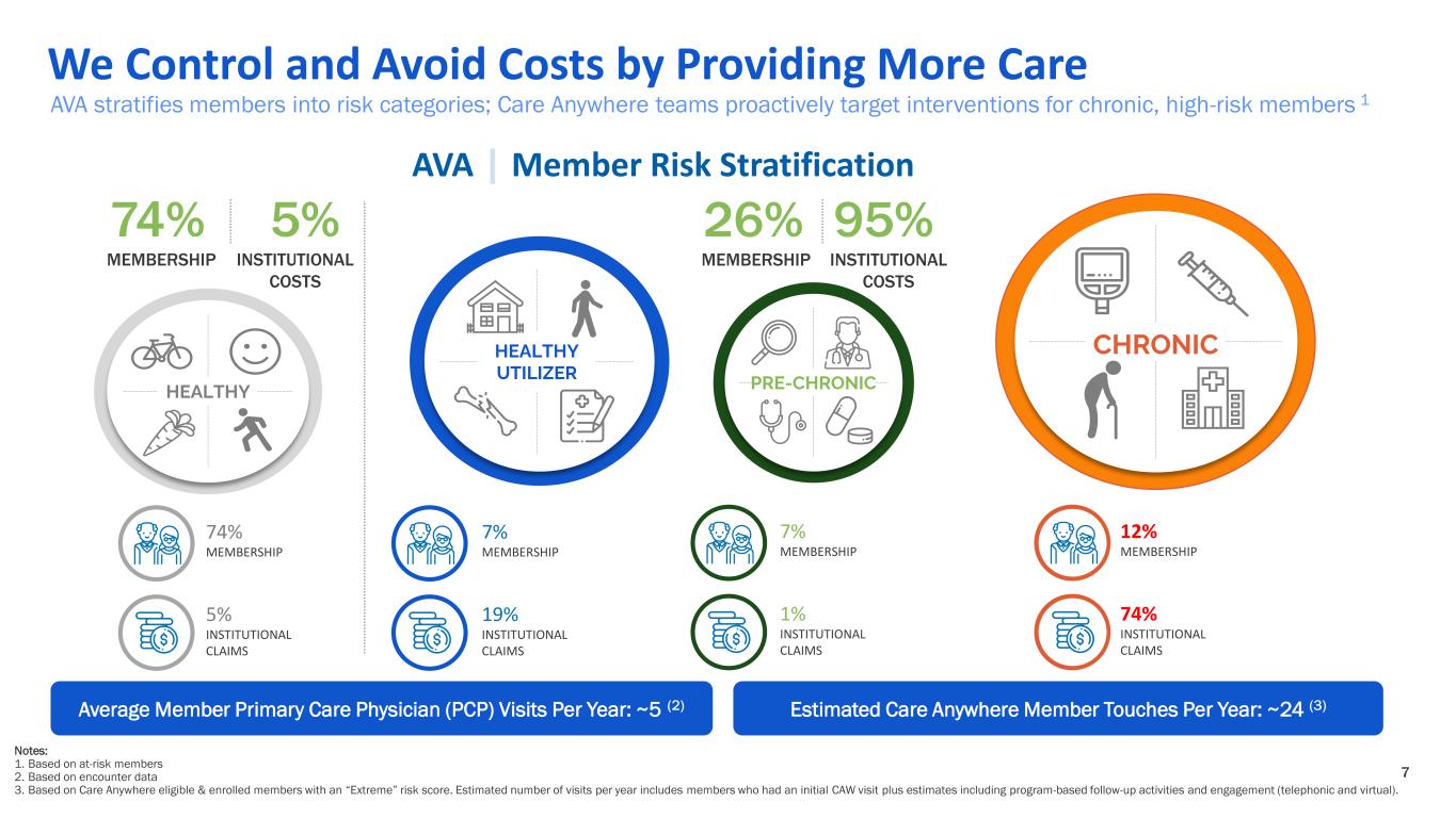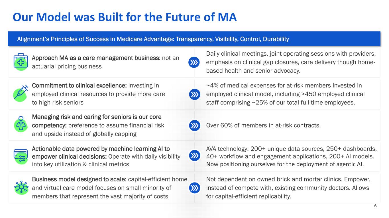 6 Our Model was Built for the Future of MA Commitment to clinical excellence: investing in employed clinical resources to provide more care to high-risk seniors Managing risk and caring for seniors is our core competency: preference to assume financial risk and upside instead of globally capping Actionable data powered by machine learning AI to empower clinical decisions: Operate with daily visibility into key utilization & clinical metrics Business model designed to scale: capital-efficient home and virtual care model focuses on small minority of members that represent the vast majority of costs Approach MA as a care management business: not an actuarial pricing business Alignment’s Principles of Success in Medicare Advantage: Transparency, Visibility, Control, Durability ~4% of medical expenses for at-risk members invested in employed clinical model, including >450 employed clinical staff comprising ~25% of our total full-time employees. Over 60% of members in at-risk contracts. AVA technology: 200+ unique data sources, 250+ dashboards, 40+ workflow and engagement applications, 200+ AI models. Now positioning ourselves for the deployment of agentic AI. Not dependent on owned brick and mortar clinics. Empower, instead of compete with, existing community doctors. Allows for capital-efficient replicability. Daily clinical meetings, joint operating sessions with providers, emphasis on clinical gap closures, care delivery though home- based health and senior advocacy.