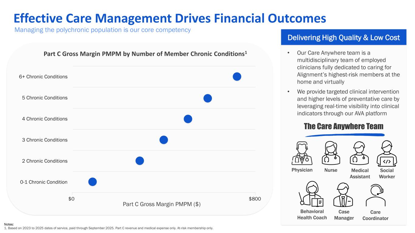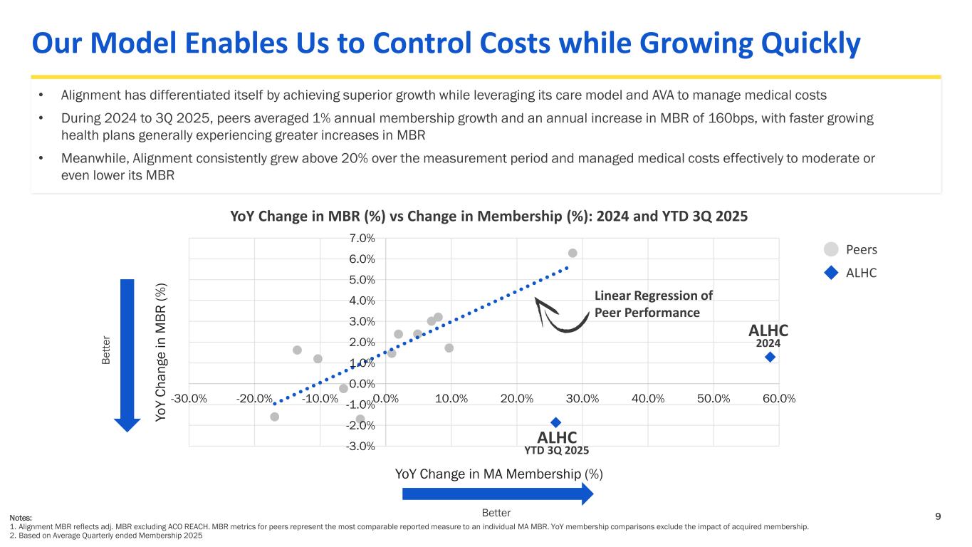 8 $0 $100 $200 $300 $400 $500 $600 $700 $800 0-1 Chronic Condition 2 Chronic Conditions 3 Chronic Conditions 4 Chronic Conditions 5 Chronic Conditions 6+ Chronic Conditions Effective Care Management Drives Financial Outcomes Notes: 1. Based on 2023 to 2025 dates of service, paid through September 2025. Part C revenue and medical expense only. At-risk membership only. Part C Gross Margin PMPM by Number of Member Chronic Conditions1 • Our Care Anywhere team is a multidisciplinary team of employed clinicians fully dedicated to caring for Alignment’s highest-risk members at the home and virtually • We provide targeted clinical intervention and higher levels of preventative care by leveraging real-time visibility into clinical indicators through our AVA platform Delivering High Quality & Low Cost Managing the polychronic population is our core competency The Care Anywhere Team Physician Nurse Case Manager Behavioral Health Coach Care Coordinator Medical Assistant Social Worker Part C Gross Margin PMPM ($)