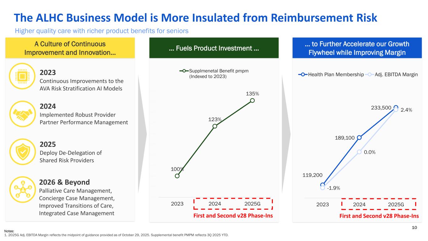 9 Our Model Enables Us to Control Costs while Growing Quickly Notes: 1. Alignment MBR reflects adj. MBR excluding ACO REACH. MBR metrics for peers represent the most comparable reported measure to an individual MA MBR. YoY membership comparisons exclude the impact of acquired membership. 2. Based on Average Quarterly ended Membership 2025 • Alignment has differentiated itself by achieving superior growth while leveraging its care model and AVA to manage medical costs • During 2024 to 3Q 2025, peers averaged 1% annual membership growth and an annual increase in MBR of 160bps, with faster growing health plans generally experiencing greater increases in MBR • Meanwhile, Alignment consistently grew above 20% over the measurement period and managed medical costs effectively to moderate or even lower its MBR -3.0% -2.0% -1.0% 0.0% 1.0% 2.0% 3.0% 4.0% 5.0% 6.0% 7.0% -30.0% -20.0% -10.0% 0.0% 10.0% 20.0% 30.0% 40.0% 50.0% 60.0% Y o Y C h a n g e i n M B R ( % ) YoY Change in MA Membership (%) YoY Change in MBR (%) vs Change in Membership (%): 2024 and YTD 3Q 2025 B e tt e r Better ALHC 2024 ALHC YTD 3Q 2025 Linear Regression of Peer Performance Peers ALHC