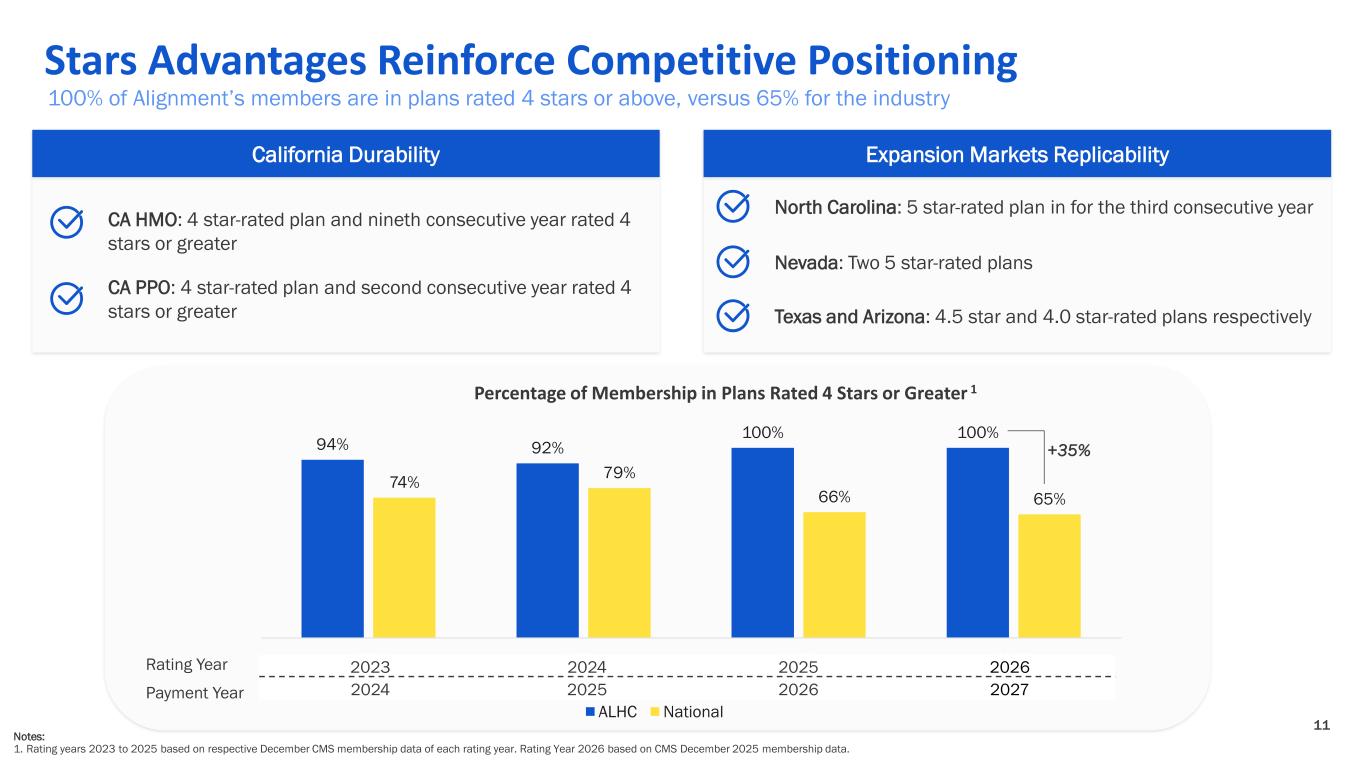 Alignment’s proven care-centered model continues to deliver high-quality outcomes and create shareholder value by serving seniors. Based on Centers for Medicare & Medicaid Services star ratings, 100% of its members are enrolled in plans rated 4 stars or higher for the second consecutive year.
