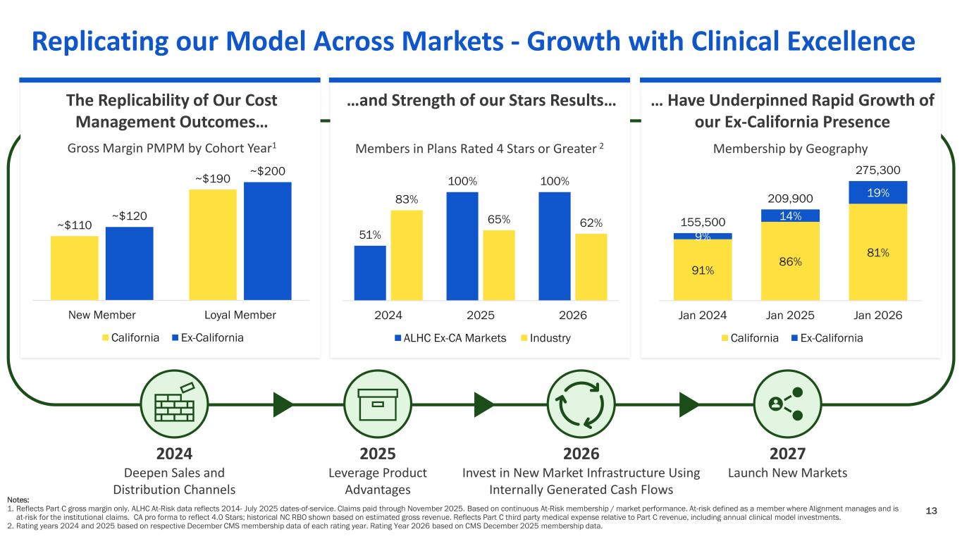 11 California Durability Expansion Markets Replicability 94% 92% 100% 100% 74% 79% 66% 65% 2023 2024 2025 2026 ALHC National Stars Advantages Reinforce Competitive Positioning 100% of Alignment’s members are in plans rated 4 stars or above, versus 65% for the industry Rating Year Payment Year 2023 2024 2025 2026 2024 2025 2026 2027 Percentage of Membership in Plans Rated 4 Stars or Greater 1 North Carolina: 5 star-rated plan in for the third consecutive year Nevada: Two 5 star-rated plans Texas and Arizona: 4.5 star and 4.0 star-rated plans respectively Notes: 1. Rating years 2023 to 2025 based on respective December CMS membership data of each rating year. Rating Year 2026 based on CMS December 2025 membership data. +35% CA HMO: 4 star-rated plan and nineth consecutive year rated 4 stars or greater CA PPO: 4 star-rated plan and second consecutive year rated 4 stars or greater