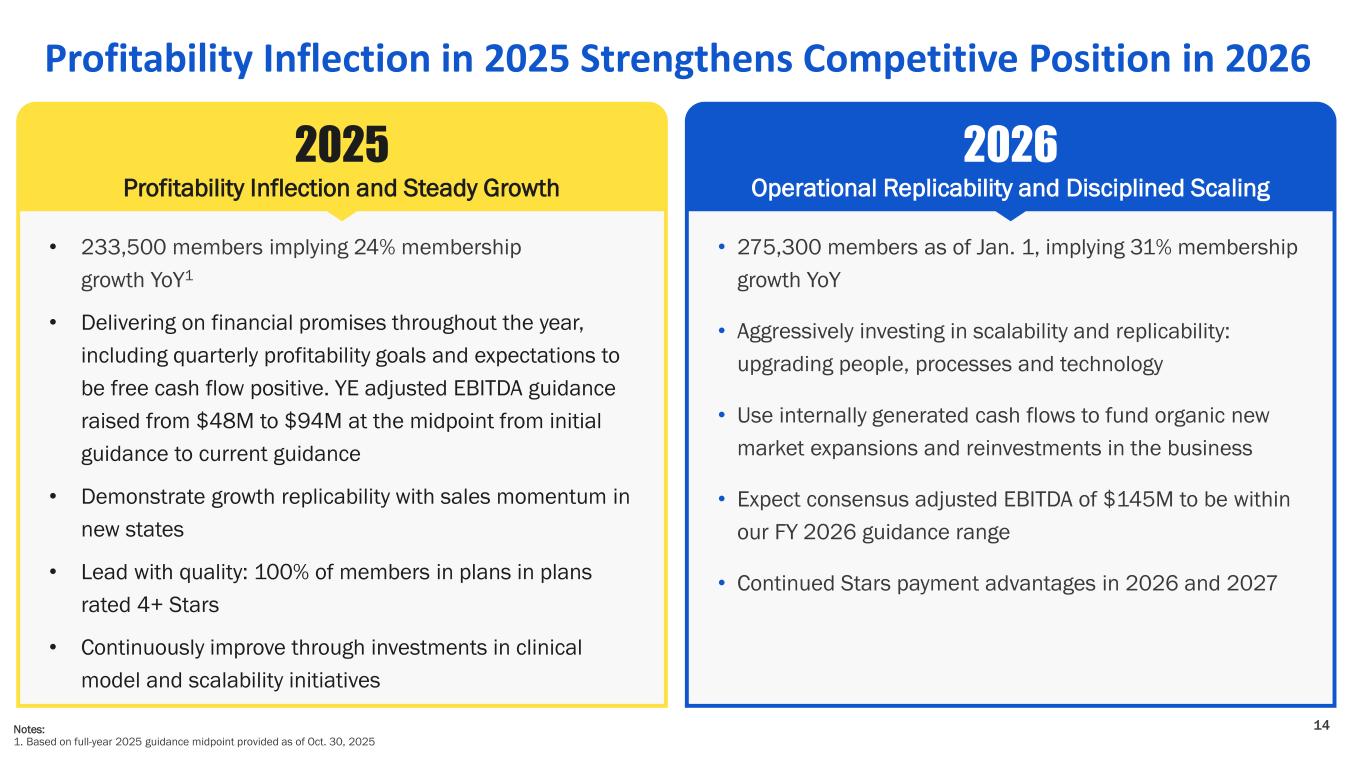 Following its AEP results, the company expects to have health plan membership of 290,000 to 296,000 at year-end 2026, representing growth of approximately 24% to 27% relative to the midpoint of its year-end 2025 membership guidance provided on Oct. 30, 2025. Furthermore, the company is announcing its expectation that consensus adjusted EBITDA of approximately $145 million in 2026 will be within its full-year 2026 guidance range. Full-year 2026 guidance will be provided at its fourth-quarter 2025 earnings call.