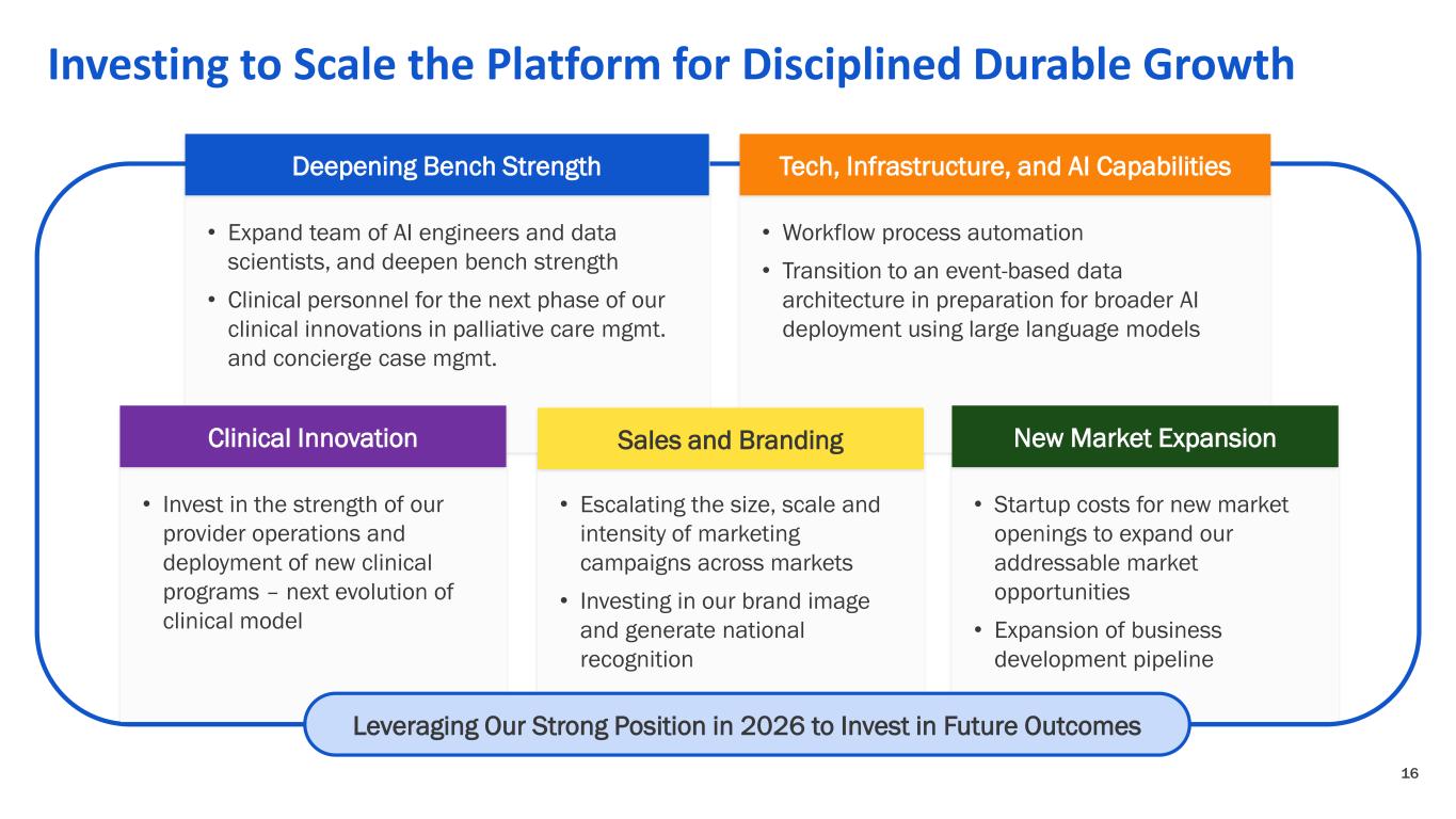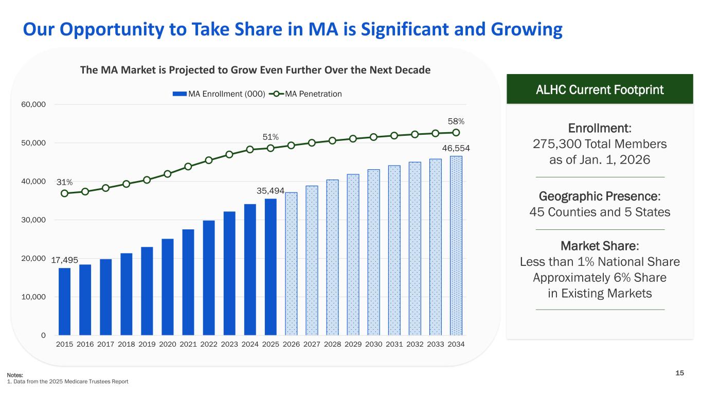 15 Our Opportunity to Take Share in MA is Significant and Growing 17,495 35,494 46,554 31% 51% 58% -30% -20% -10% 0% 10% 20% 30% 40% 50% 60% 70% 0 10,000 20,000 30,000 40,000 50,000 60,000 2015 2016 2017 2018 2019 2020 2021 2022 2023 2024 2025 2026 2027 2028 2029 2030 2031 2032 2033 2034 MA Enrollment (000) MA Penetration Notes: 1. Data from the 2025 Medicare Trustees Report The MA Market is Projected to Grow Even Further Over the Next Decade ALHC Current Footprint Enrollment: 275,300 Total Members as of Jan. 1, 2026 Geographic Presence: 45 Counties and 5 States Market Share: Less than 1% National Share Approximately 6% Share in Existing Markets